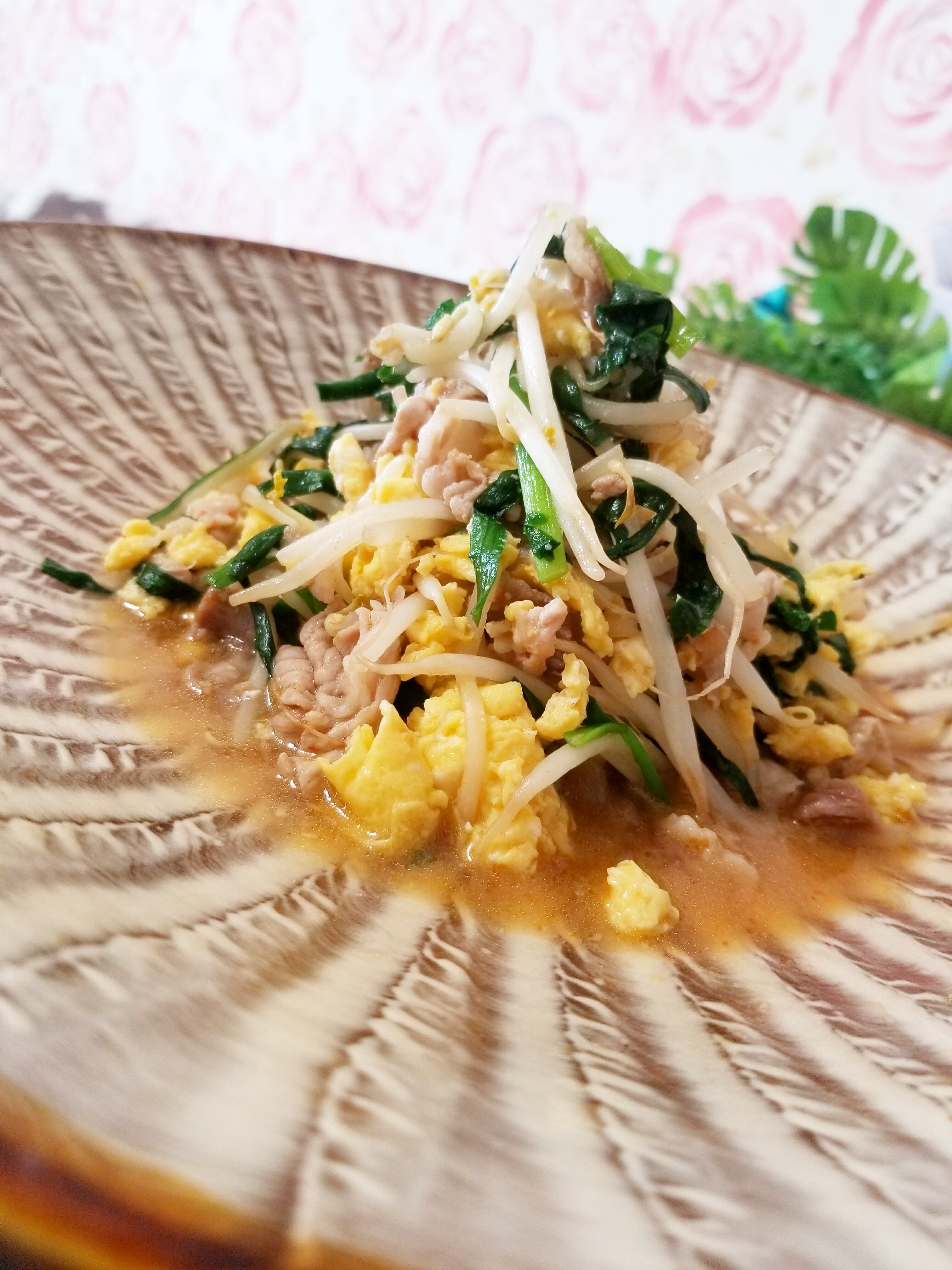 - もやしとニラを加えて軽く炒めて卵を戻し入れ残りのタレをかけて全てを炒め合わせたら出来上がり