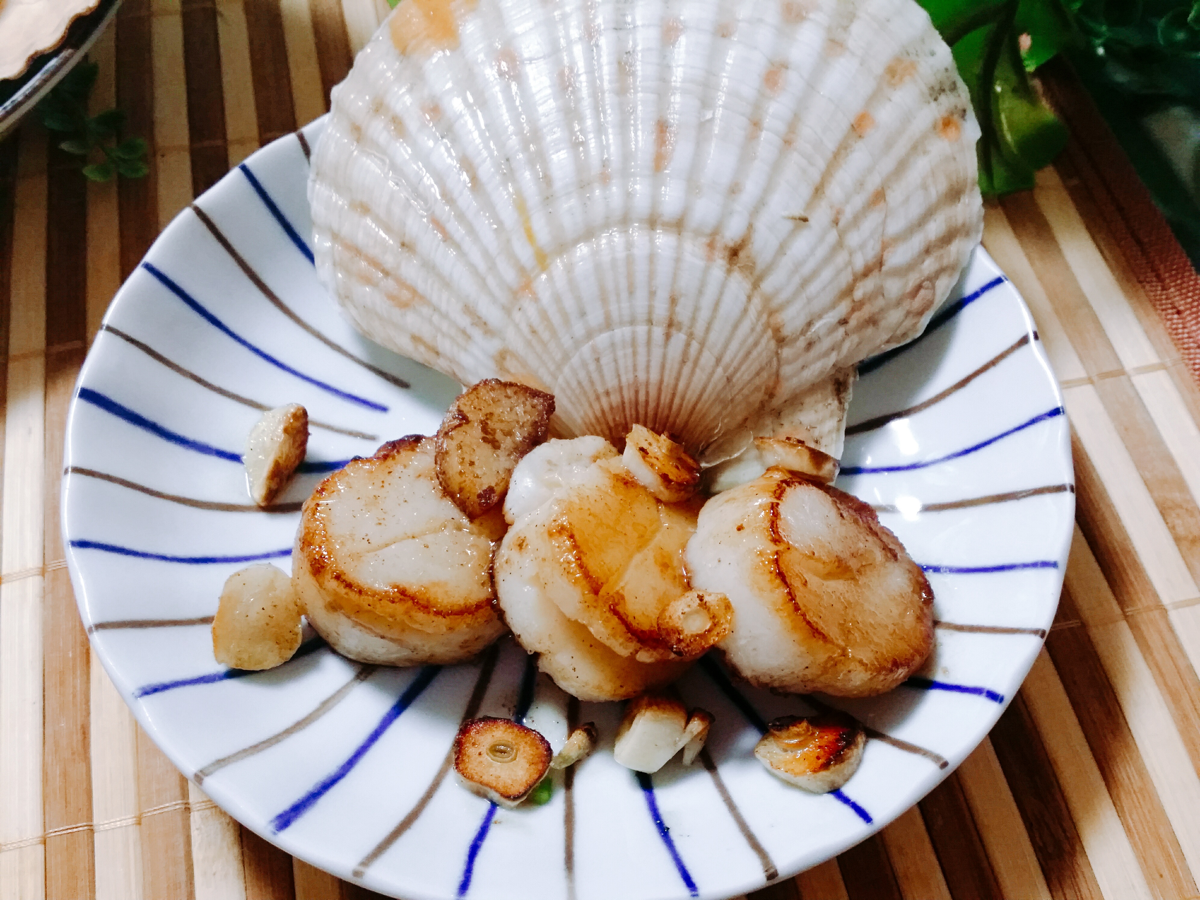 - フライパンにオリーブオイルとにんにくを入れて中火にかけ、香りが立ってきたらホタテを焼く